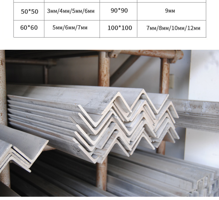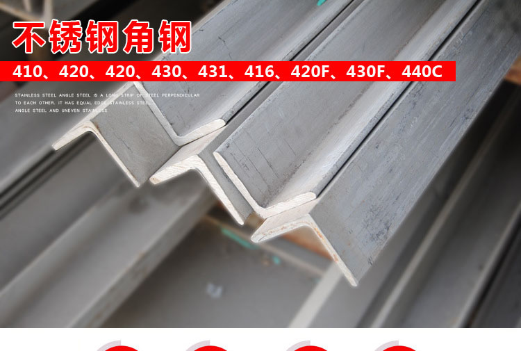 不銹鋼角鋼是兩邊互相垂直成角形的長條鋼材。有等邊不銹鋼角鋼和不等邊不銹鋼角鋼之分。等邊不銹鋼角鋼的兩個邊寬相等。其規格以邊寬×邊寬×邊厚的毫米數表示。如“∠25×25×3”,即表示邊寬為 25毫米、邊厚為3毫米的等邊不銹鋼角鋼。也可用型號表示,型號是邊寬的厘米數,如∠2.5#。型號不表示同一型號中不同邊厚的尺寸,因而在合同等單據上將不銹鋼角鋼的邊寬、邊厚尺寸填寫齊全,避免單獨用型號表示。熱軋等邊不銹鋼角鋼的規格為2#-20#。